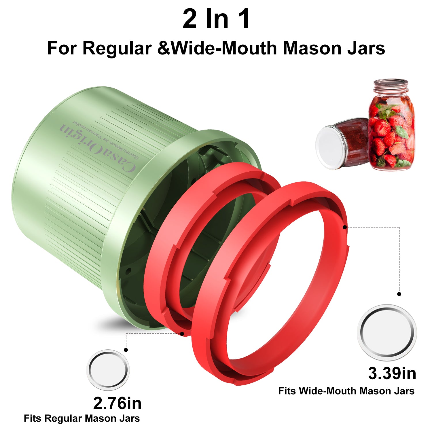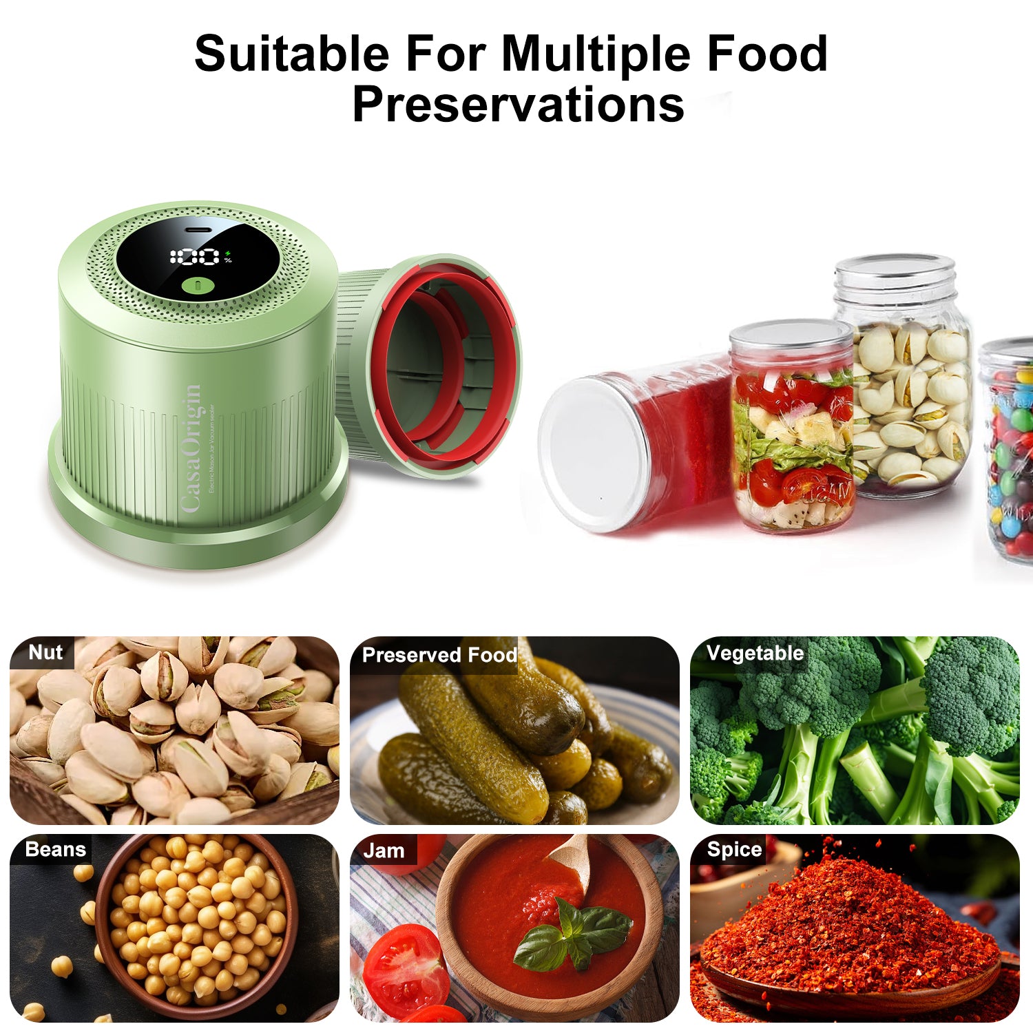 CASAORIGIN vacuum sealer kit works with both wide and regular mouth mason jars, creating tight seals automatically. It's ideal for dry canning and storing fermented foods, making food preservation easy. Simply place it on the jar and activate the vacuum pump—no extra accessories needed.