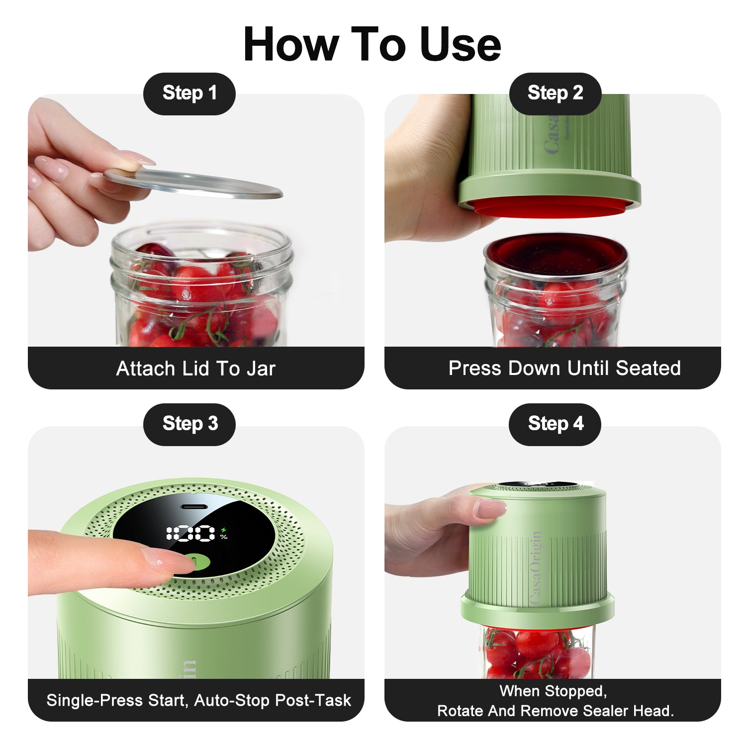 CASAORIGIN electric mason jar vacuum sealer is user-friendly with automatic pressure sensing and one-touch activation. Perfect for bulk canning and long-term storage, it seals quart and half-gallon jars easily without messy pumps. Just place it on the lid and click to seal.